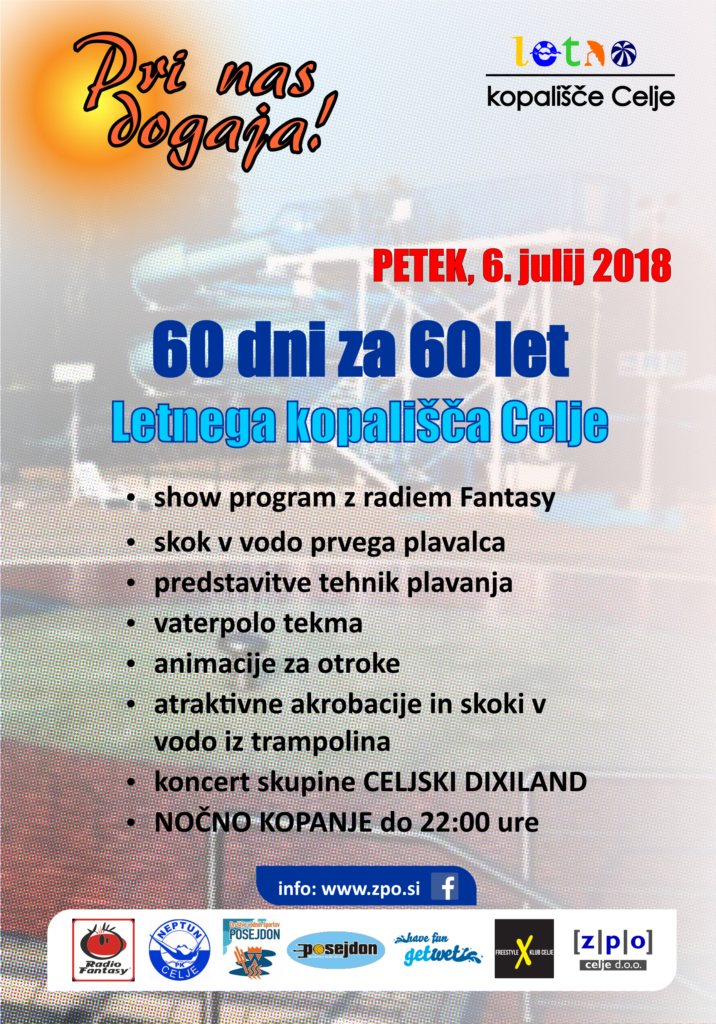 V letu 2017 je Letno kopališče Celje obeležilo 60 let. Visoko obletnico, tega pomembnega celjskega objekta, ki Celjane razveseljuje že toliko let, bomo skupaj z zaključkom izvedenih investicijskih del obnove 50 m bazena počastili v PETEK, 13. JULIJA 2018. Dogodek bo spremljal pester animacijski program, zaigrala nam bo skupina Celjski Dixiland, kopanje pa bo mogoče vse do 22 ure. VABLJENI!