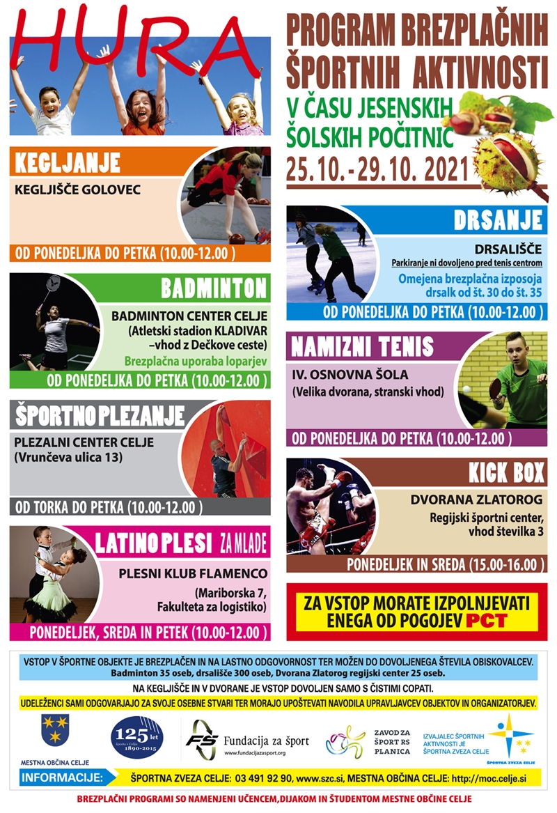 Otroci, osnovnošolci, srednješolci in študentje bodo v teh jesenskih počitnicah lahko aktivno preživljali prosti čas tudi v različnih športnih programih, ki jih brezplačno omogočajo Mestna občina Celje, Športna zveza Celje, Fundacija za šport in Zavod za šport RS Planica.
