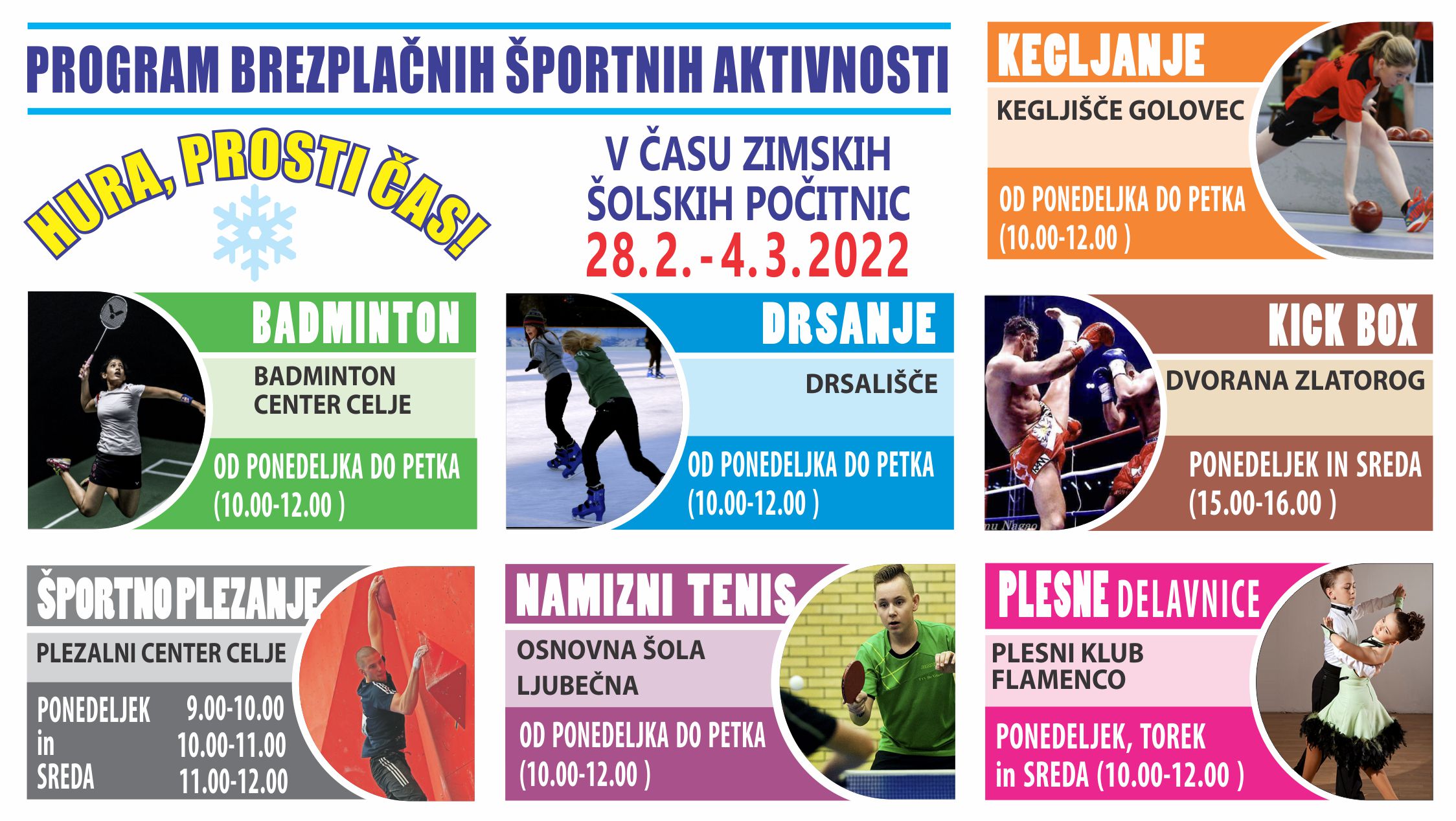 Tudi letos jim bo Športna zveza Celje v sodelovanju z MOC, Zavodom za šport RS Planica in Fundacijo za financiranje športnih organizacij v RS v času počitnic od 28.2.2022 do 4.3.2022 omogočila brezplačno udeležbo v različnih športnih aktivnostih.
