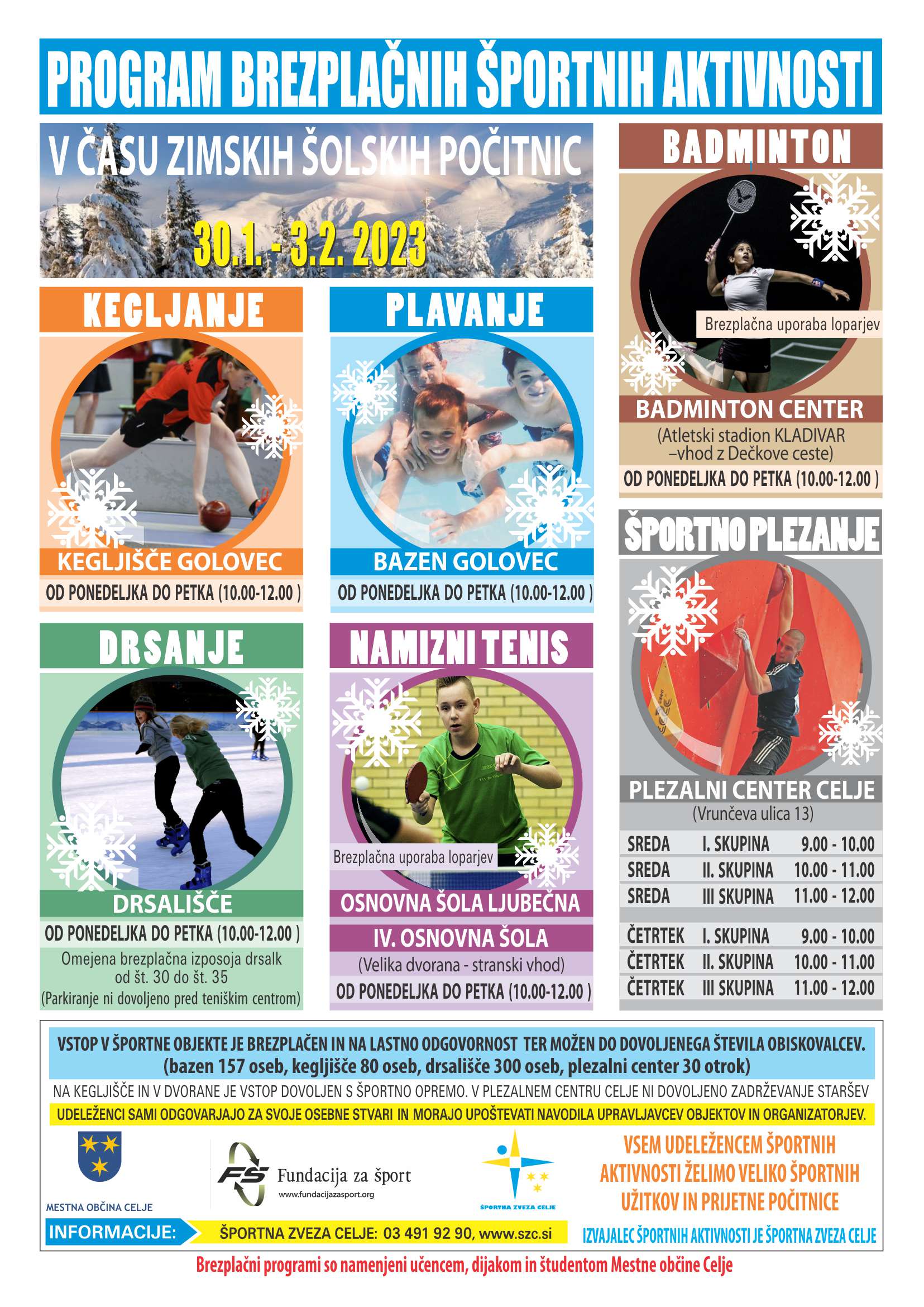 Športna zveza Celje v sodelovanju z Mestno občino Celje in Fundacijo za šport tako kot vsako leto tudi letos v času zimskih šolskih počitnic od 30.1.2023 do vključno 3.2.2023 celjskim otrokom, osnovnošolski in srednješolski mladini ter študentom omogoča udeležbo v različnih športnih aktivnostih, ki se bodo odvijale v športnih objektih Mestne občine Celje.