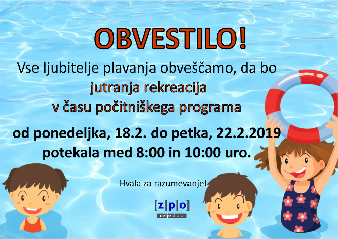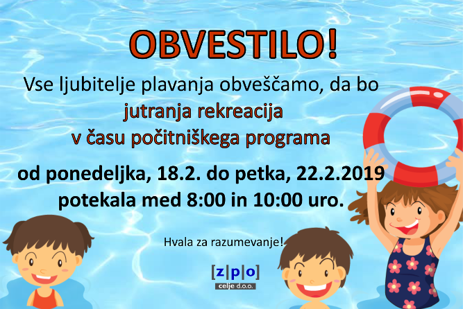 V tednu počitnic bo jutranja rekreacija plavanja med 8:00 in 10:00 uro.
